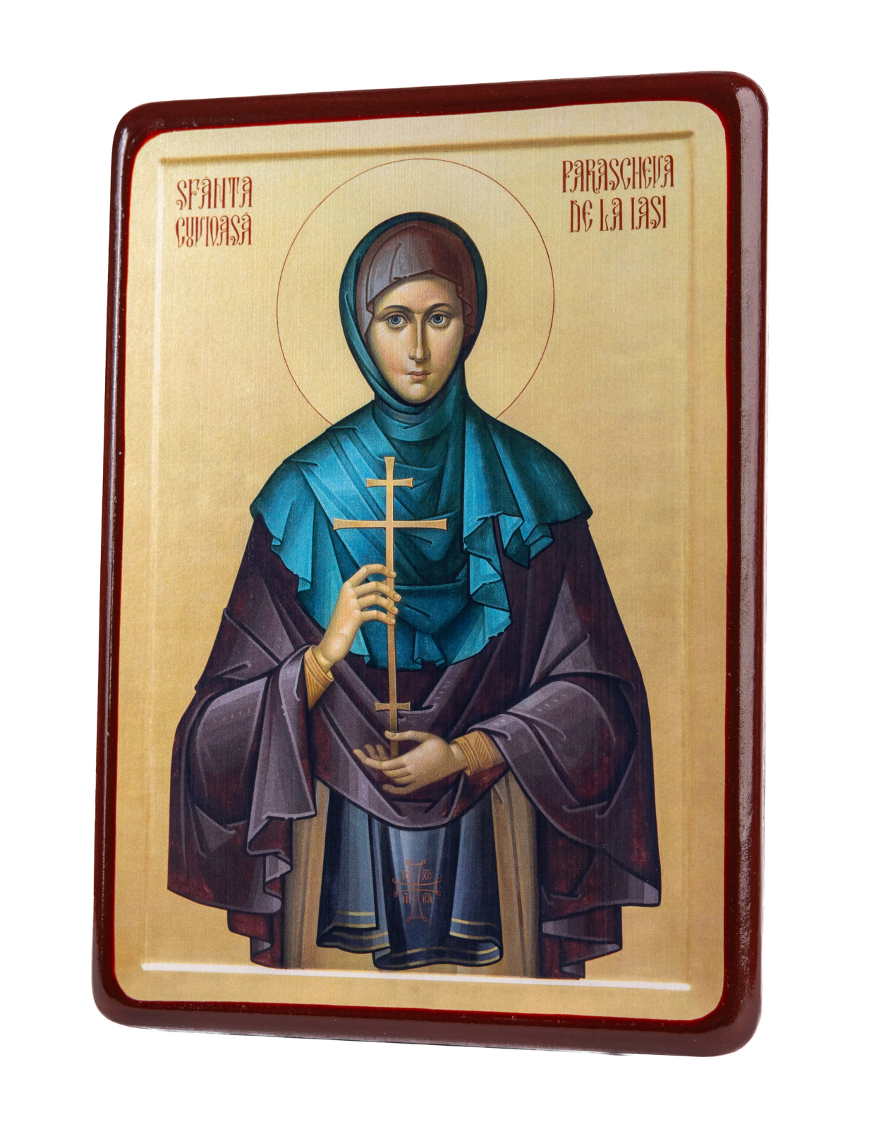 Pe spate este bătută o agățătoare aurie, iar icoana este pusă într-un plic antișoc, cu bule, de culoare kraft.