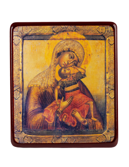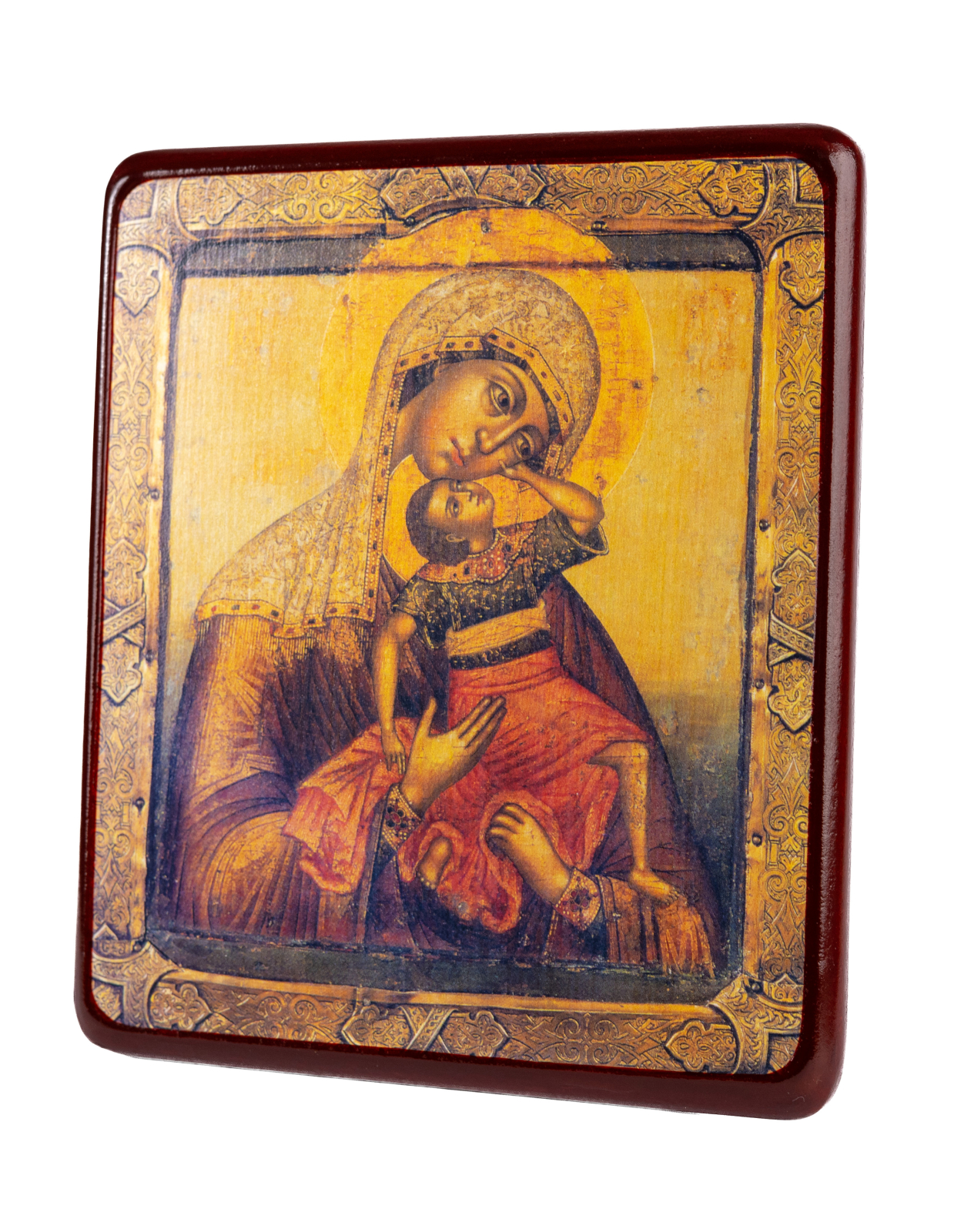 Pe spate este bătută o agățătoare aurie, iar icoana este pusă într-un plic antișoc, cu bule, de culoare kraft.