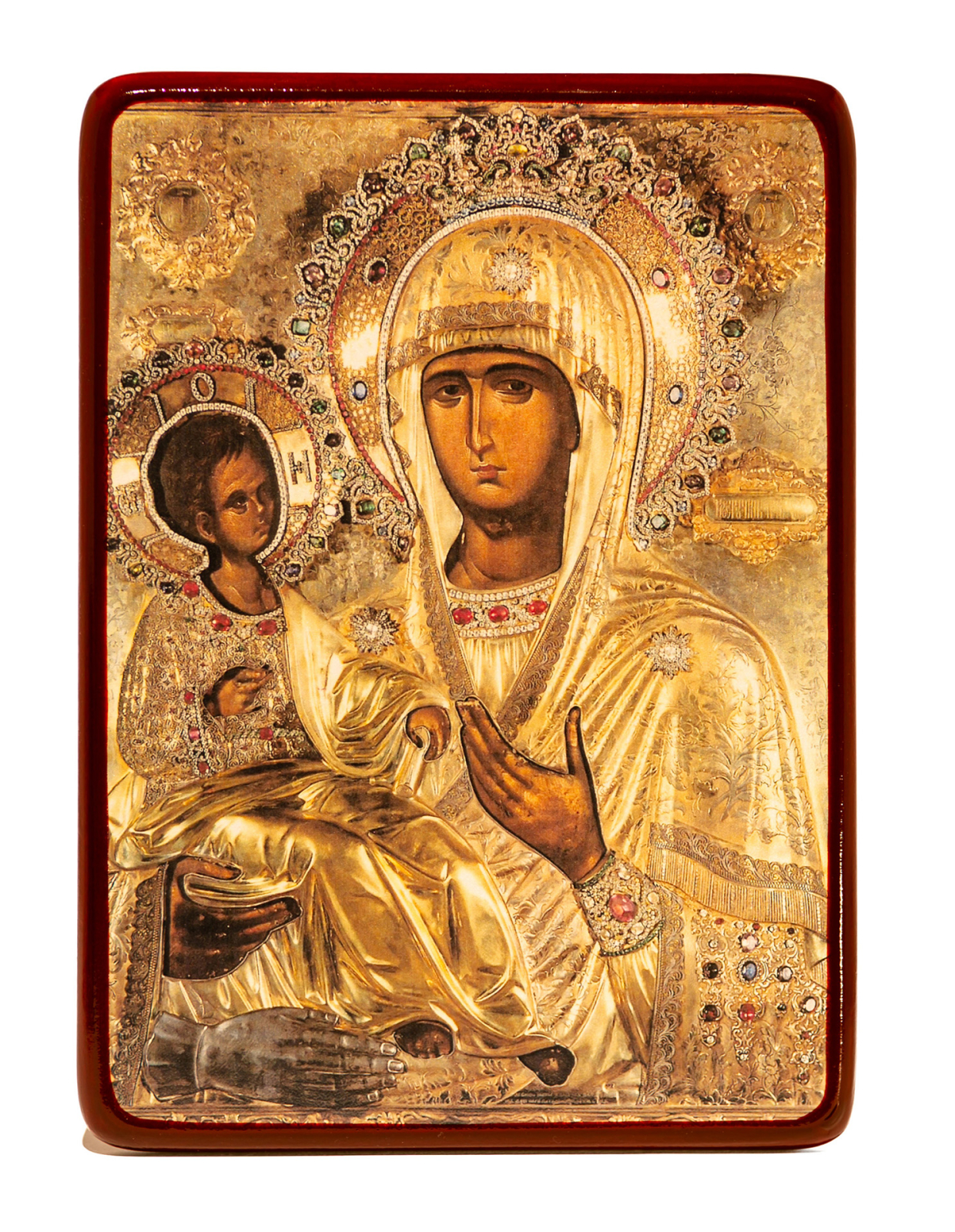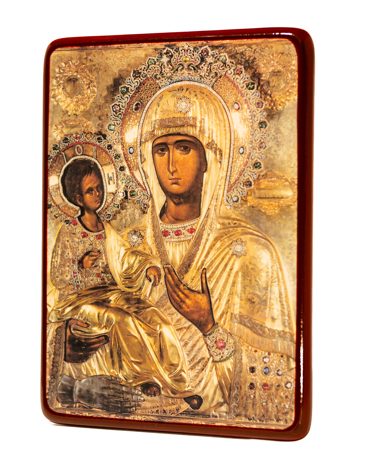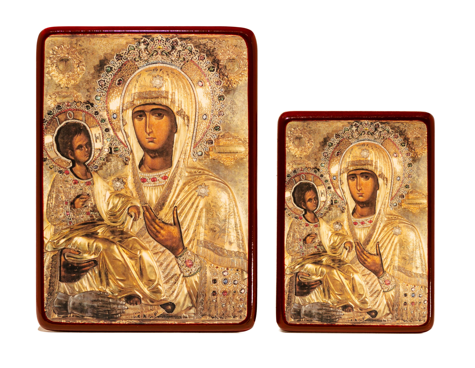 Icoana Maicii Domnului „Cu trei mâini/ Trihirusa” este legată de istoria lui Ioan din Damasc, un apărător al sfintelor icoane în timpul împăratului Leon Isaurul. Acesta a fost nedreptățit și condamnat la tăierea mâinii din cauza unei scrisori false. După multă rugăciune către Maica Domnului, Ioan a fost vindecat miraculos, rămânând cu un semn roșu. Apoi, a decis să renunțe la viața sa de la curte și s-a călugărit la Mănăstirea Sfântului Sava, dedicându-se lui Dumnezeu. Icoana a fost adusă la Mănăstirea Hilandaru, unde a devenit ocrotitoarea mănăstirii, fără a mai avea stareț, căci Maica Domnului a dorit să fie ea însăși conducătoarea. De asemenea, icoana a protejat mănăstirea de multiple primejdii, inclusiv de atacuri externe.