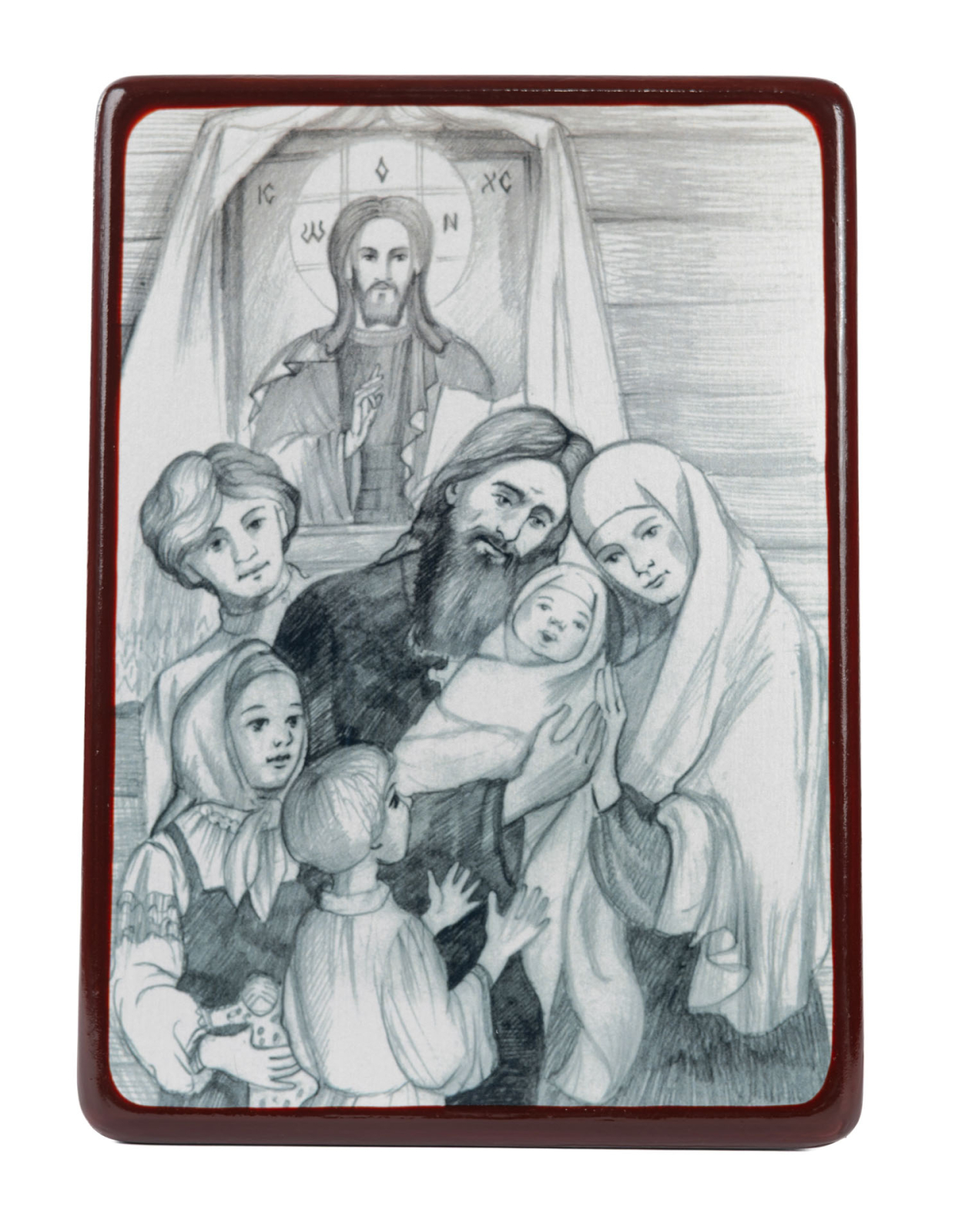 Pe spate este bătută o agățătoare aurie, iar icoana este pusă într-un plic antișoc, cu bule, de culoare kraft.